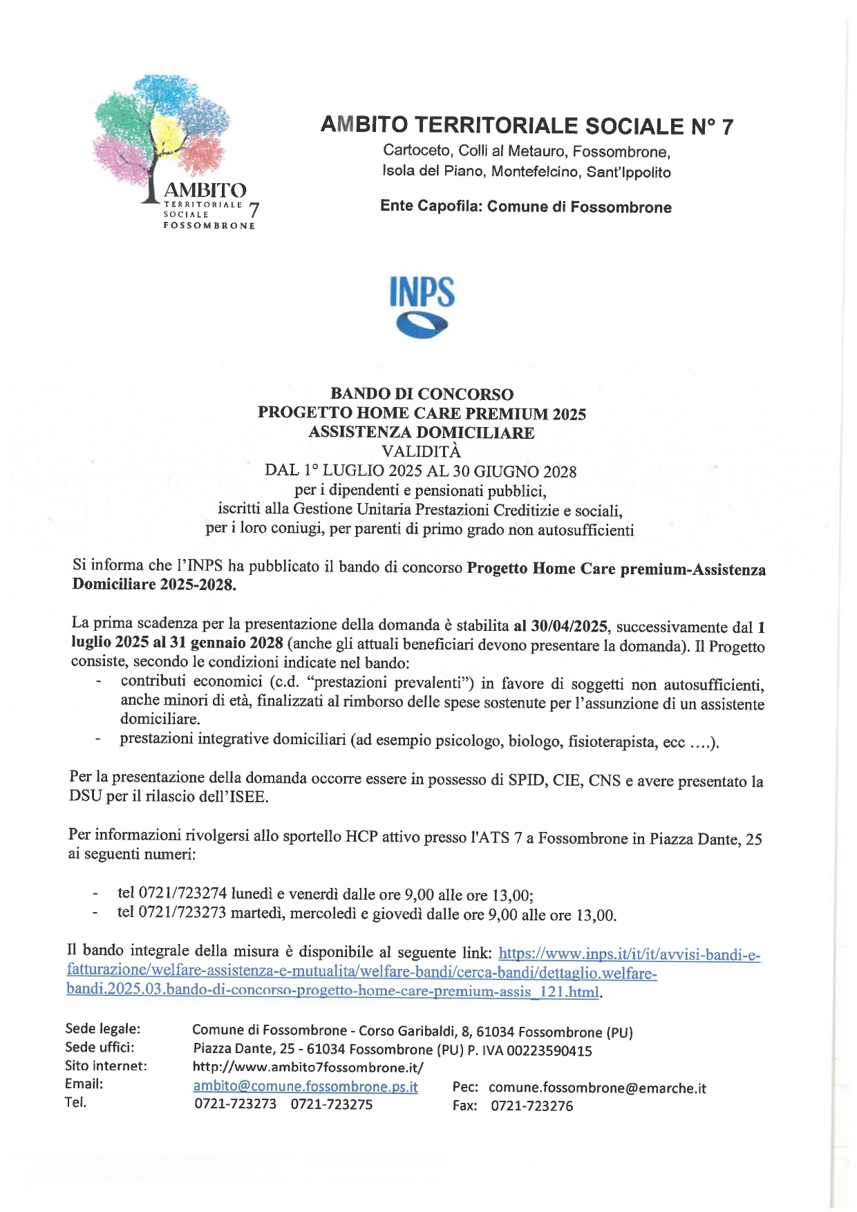 Per ulteriori informazioni rivolgersi allo sportello HCP attivo presso l'ATS 7 a Fossombrone in Piazza Dante, 25 ai seguenti numeri: